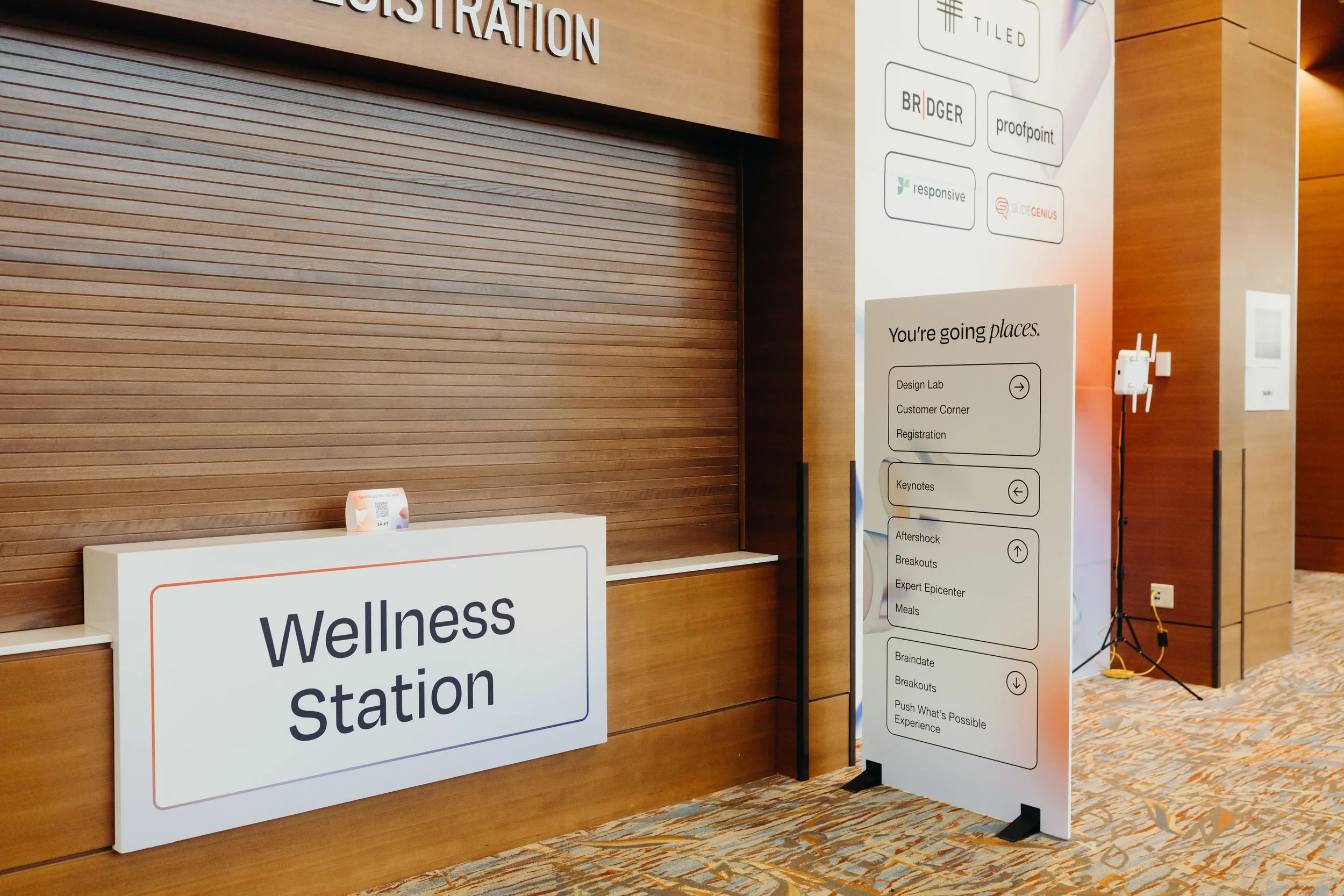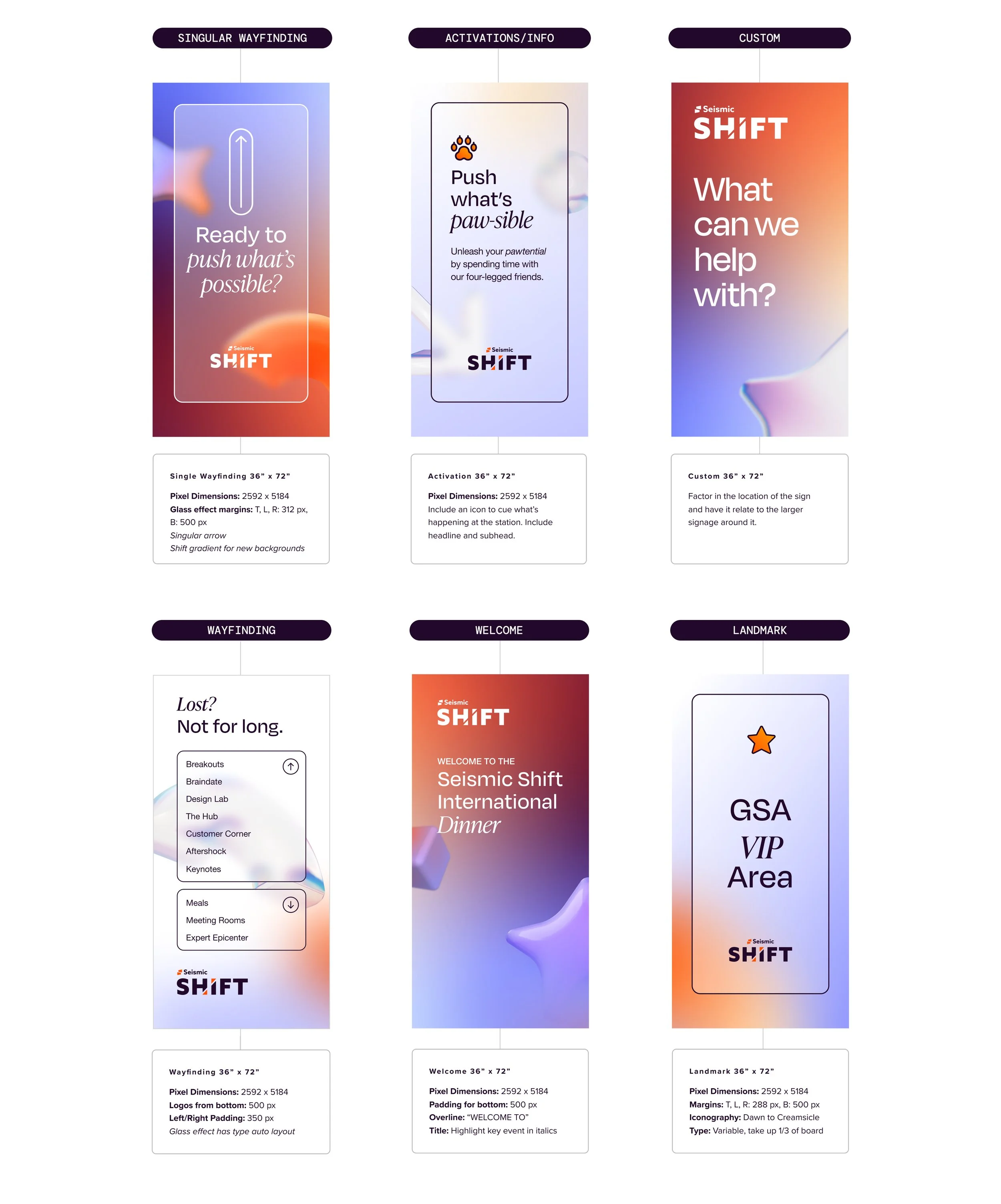 The work streams were broken down into five categories: swag, large signage, medium signage, print, and digital. Within each of these categories, I assigned a design lead. Due to the amount of work we needed to create in a short amount of time, I designed all medium signage, half of large signage, and breakout decks.