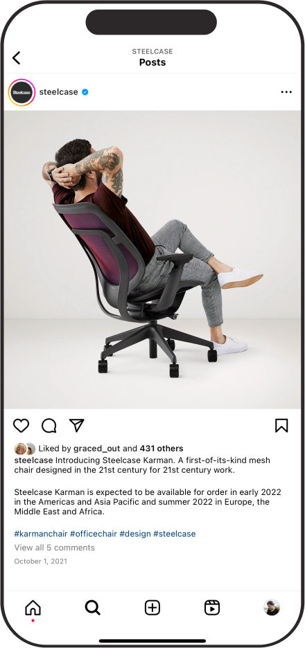 In 2021, Steelcase prepared to launch its latest office chair, an innovative piece of furniture built to ergonomically and flexibly support its user in a variety of postures, and designed with new mesh fabric technology that paired mesh’s breathability with the durability of more traditional fabrics. Steelcase needed imagery for its launch that highlighted the new and impressive features of the chair, so Distillery came in to support the production and photoshoot for the launch.
